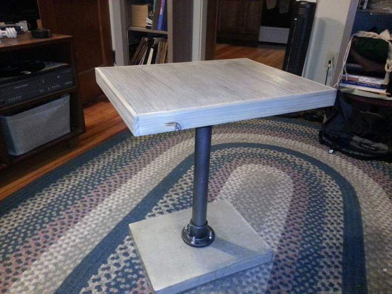 Matched set of side tables designed and built from reclaimed plywood, steel pipe and concrete. The tops are laminated 1/4″ plywood strips in three colors with solid wood edge trim. The steel pipe leg is connected by flange to the underside of the table top and to bolts embedded in the concrete base.