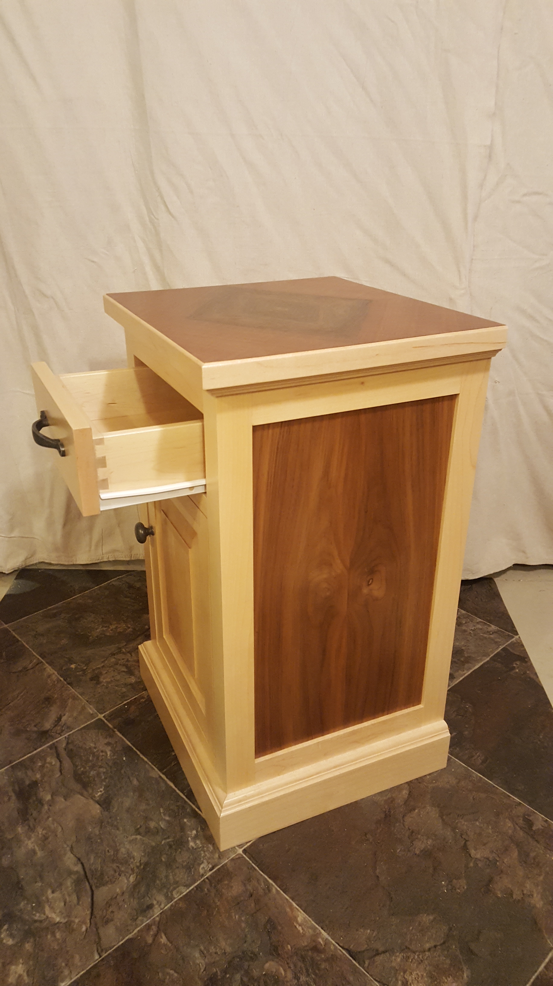 This small cabinet was built as part of an 8 week intensive course at the New England School of Architectural Woodworking. It features a four way book-match veneered top and book-matched side panels. The hard maple face-frame is joined to a maple plywood carcass using typical cabinet construction methods. The door is made of hard maple rails and stiles, with a panel of soft maple inset. The drawer is faced with hard maple attached to a dovetailed soft maple drawer box. All solid wood elements including trim were milled from rough lumber specifically chosen for the project.